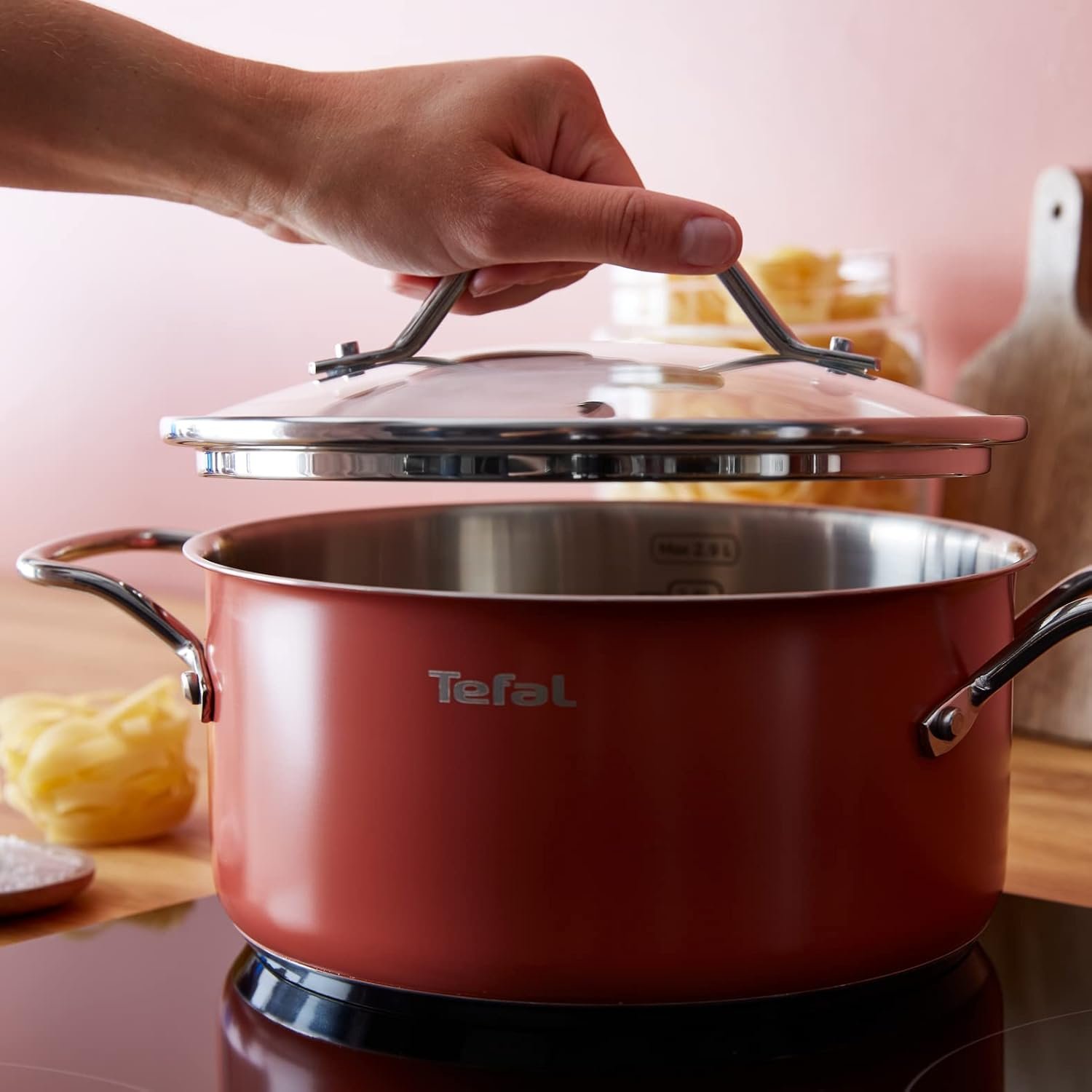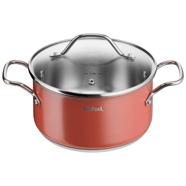 Tefal Sensation Faitout 20 cm + couvercle verre, Acier inoxydable Premium, Bords verseurs, Graduations intérieures, Induction, Compatible four